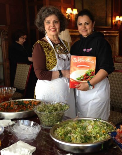 Two women in aprons holding cookbook by salads