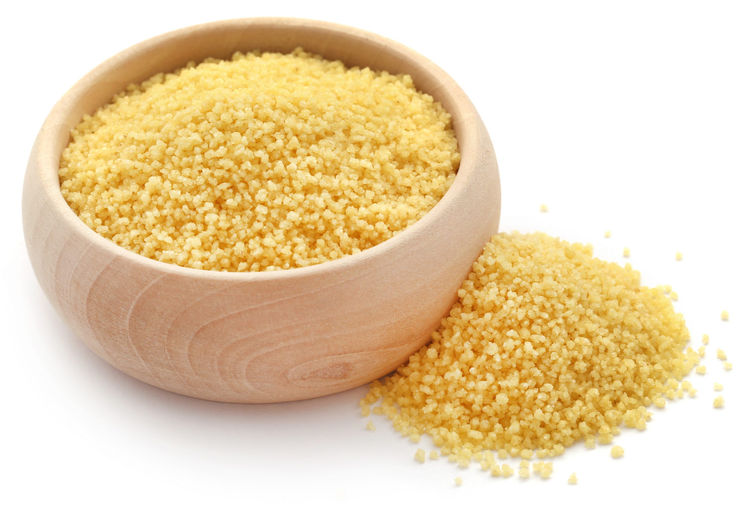 A wooden bowl of yellow food on top of white table.