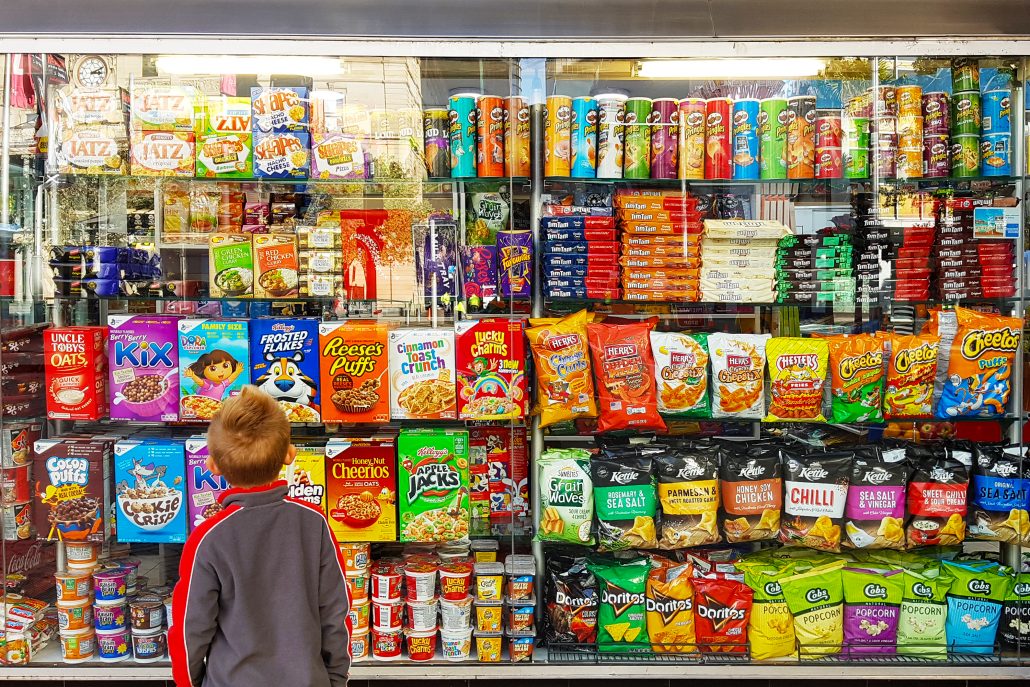 A man standing in front of shelves filled with food.
