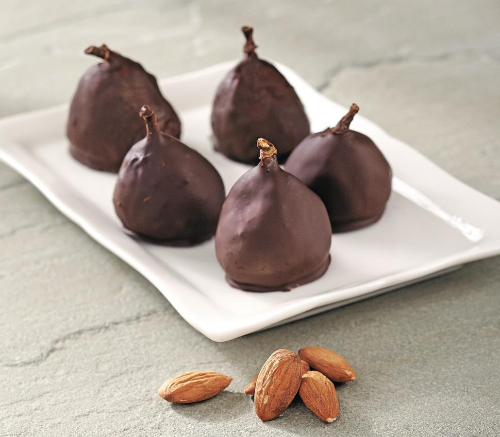 A white plate topped with chocolate covered pears next to almonds.