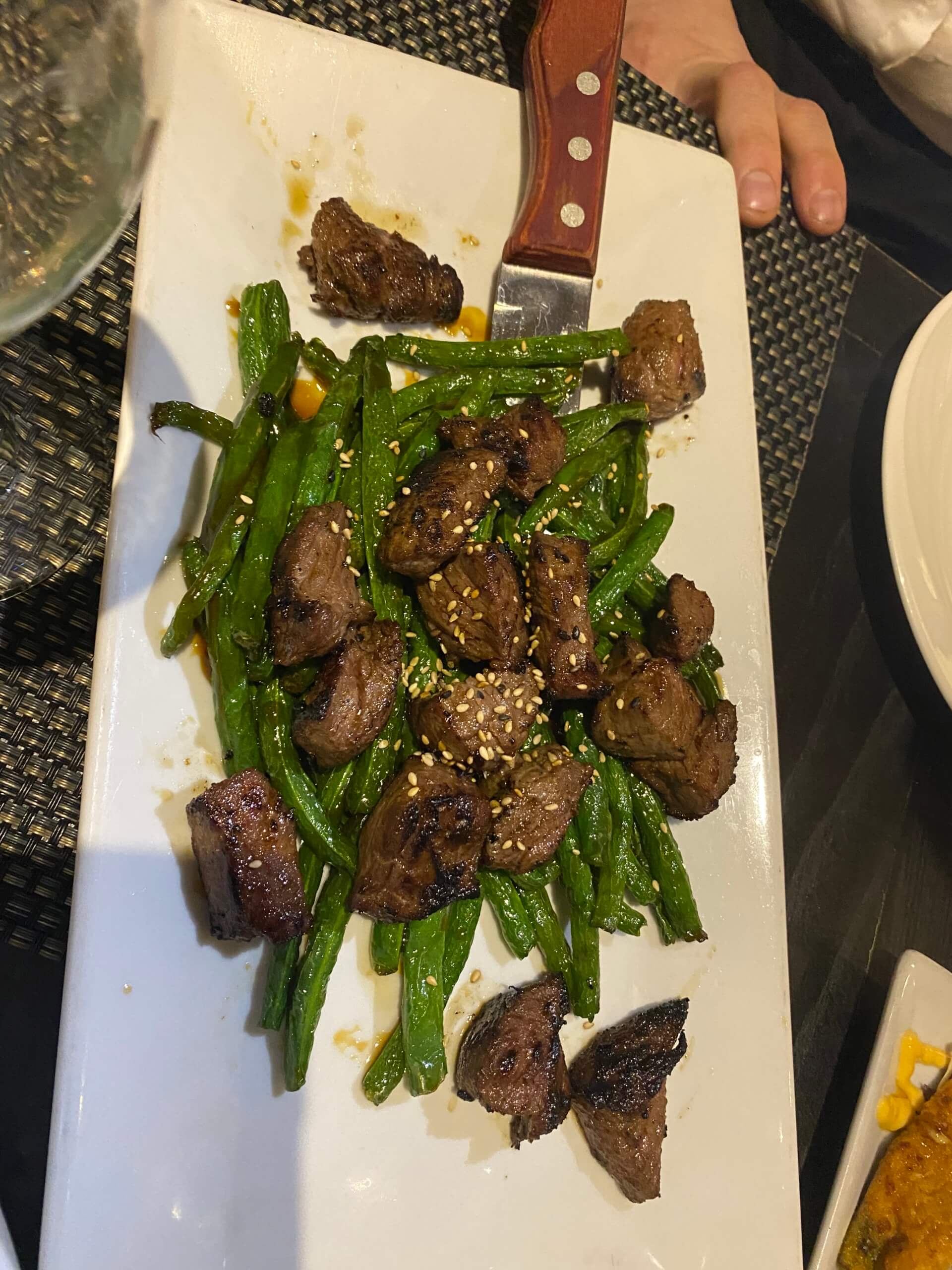 A plate of food with meat and green beans.