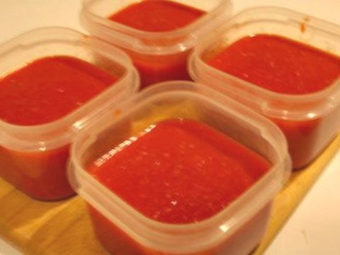 A close up of four containers filled with tomato sauce.