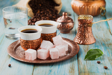 A table with coffee cups and sugar cubes on it.